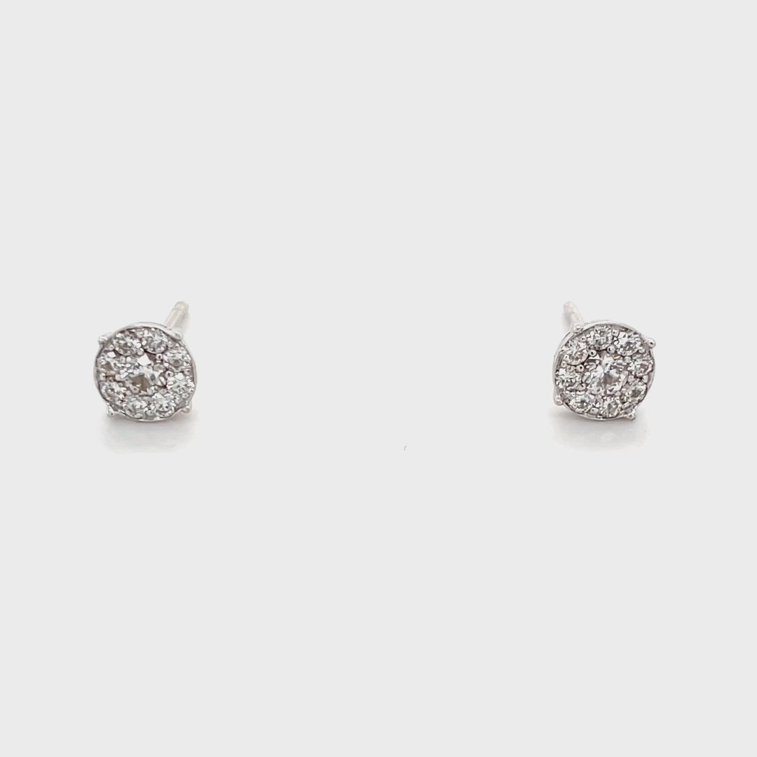 Halation of brilliance is captured in these Diamond Stud Earrings featuring a sparkling aureole of Round Brilliant-cut Diamonds pavé-set in this 18 Kt white gold ear pieces.